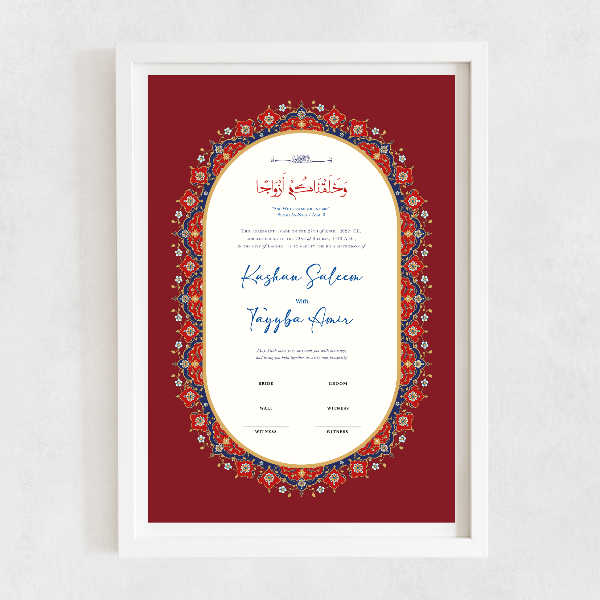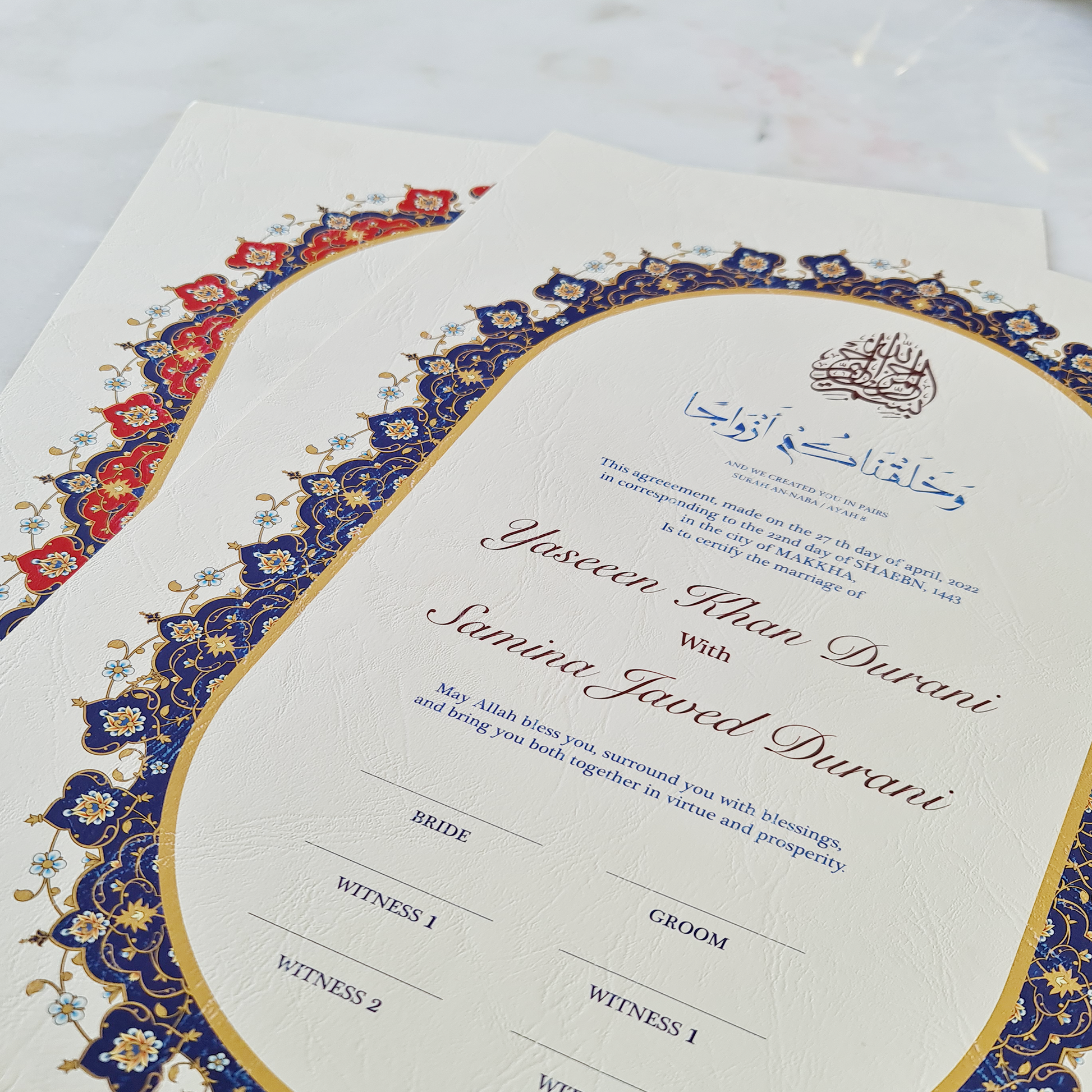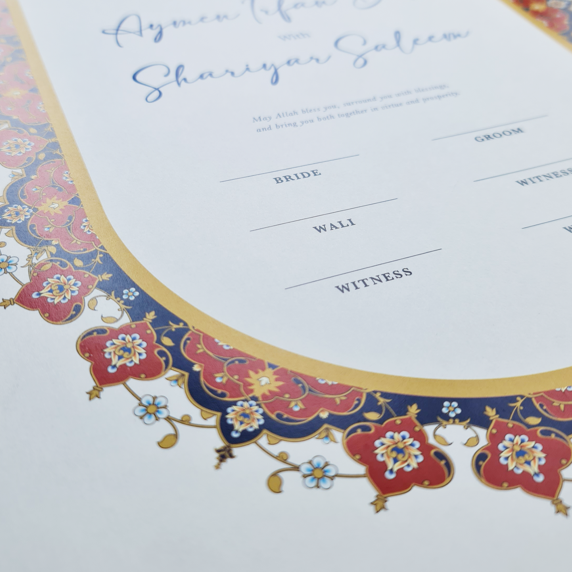 Based on a gorgeous Mughal folio, this contract is custom printed with the couple's name and wedding dates. This contract is available in maroon or gray background options.