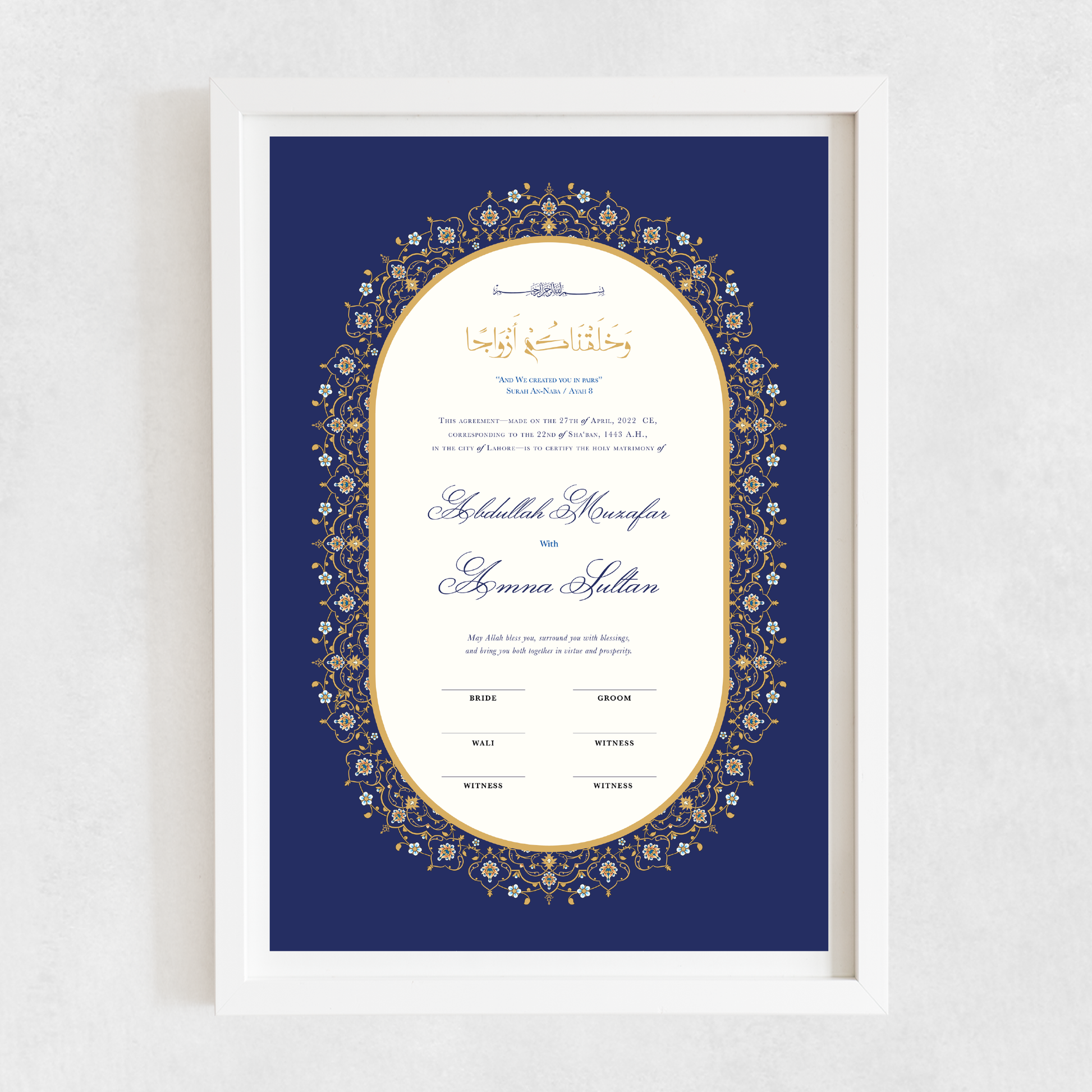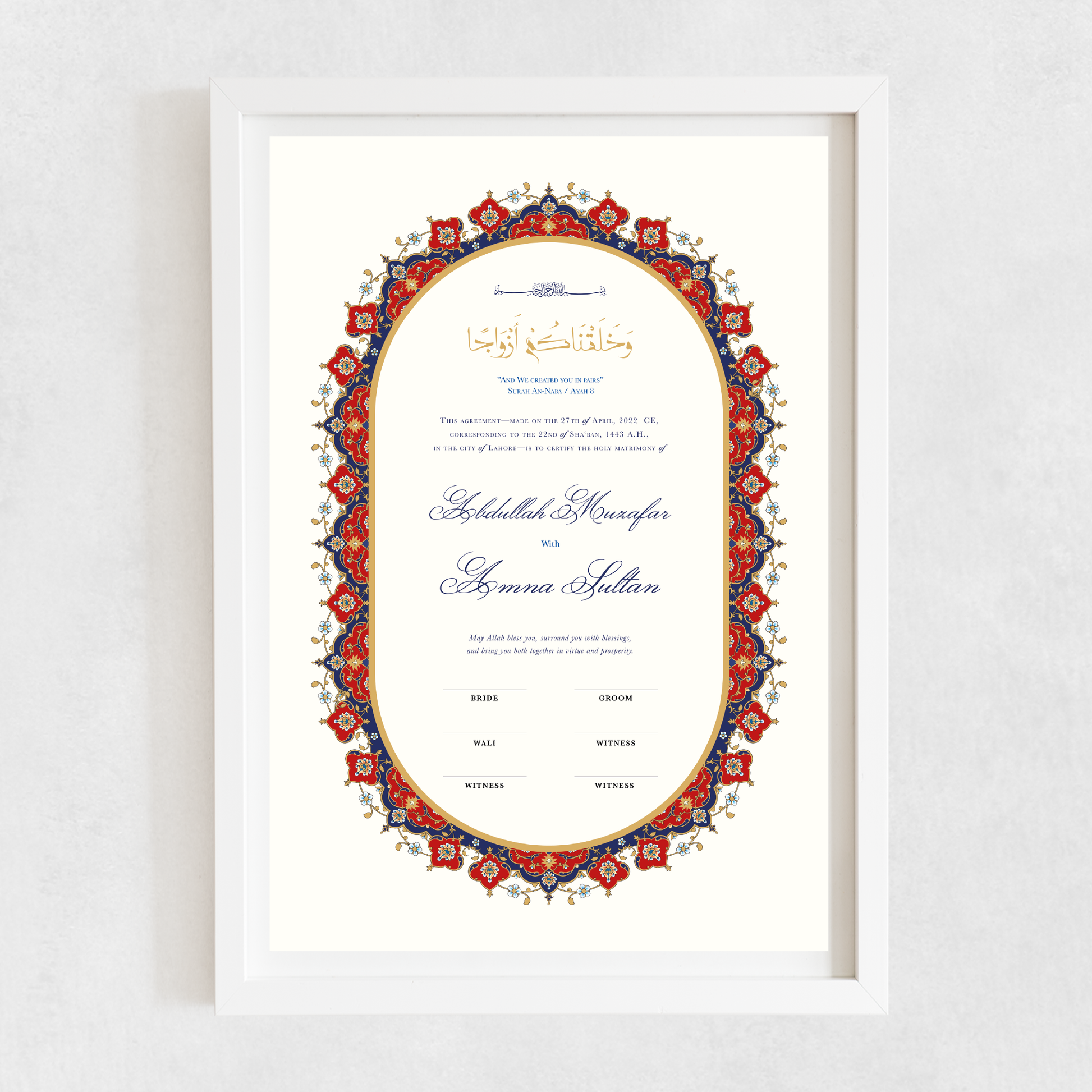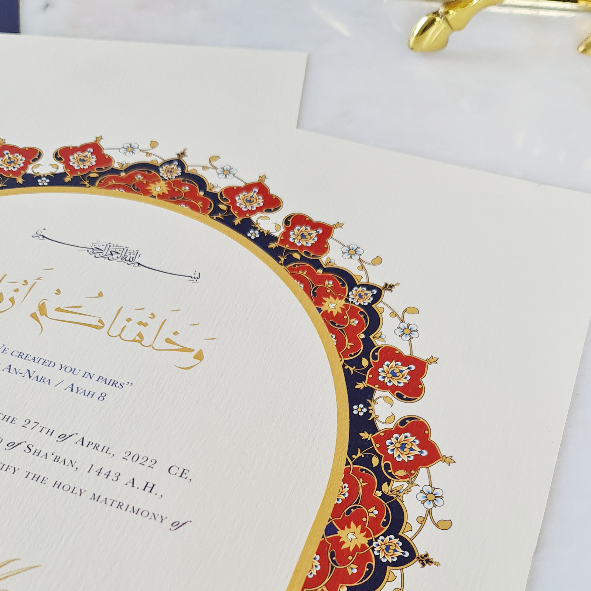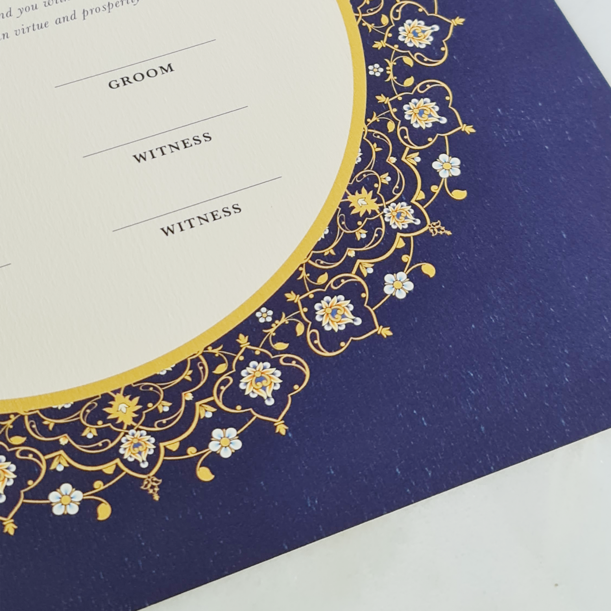 Based on a gorgeous Mughal folio, this contract is custom printed with the couple's name and wedding dates. This contract is available in maroon or gray background options.