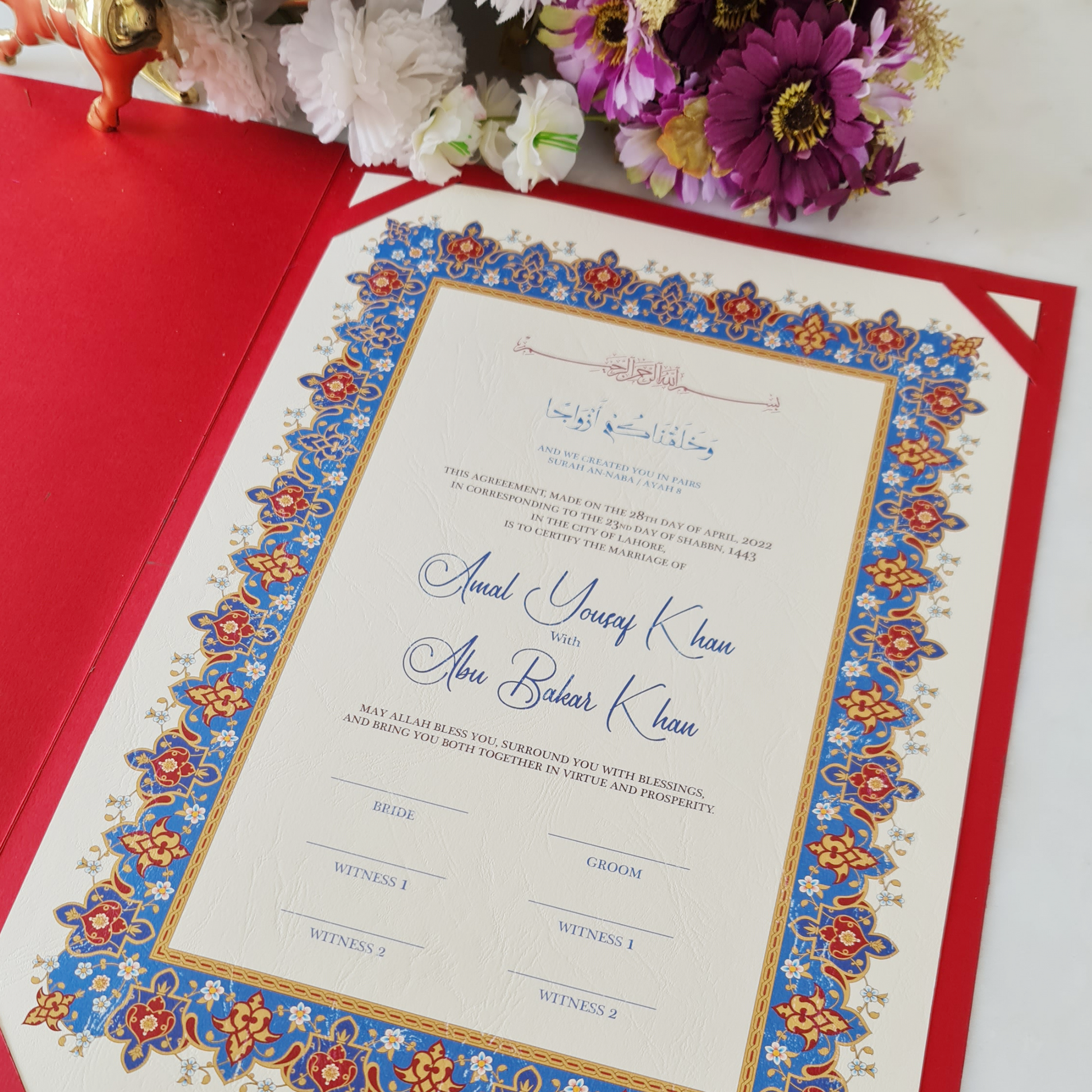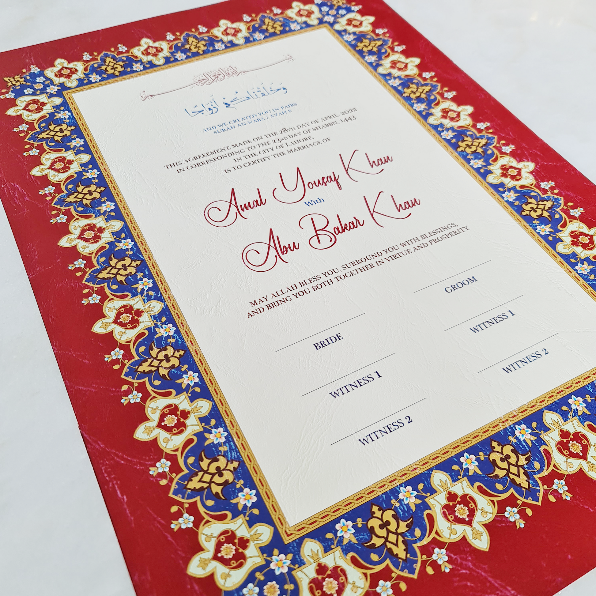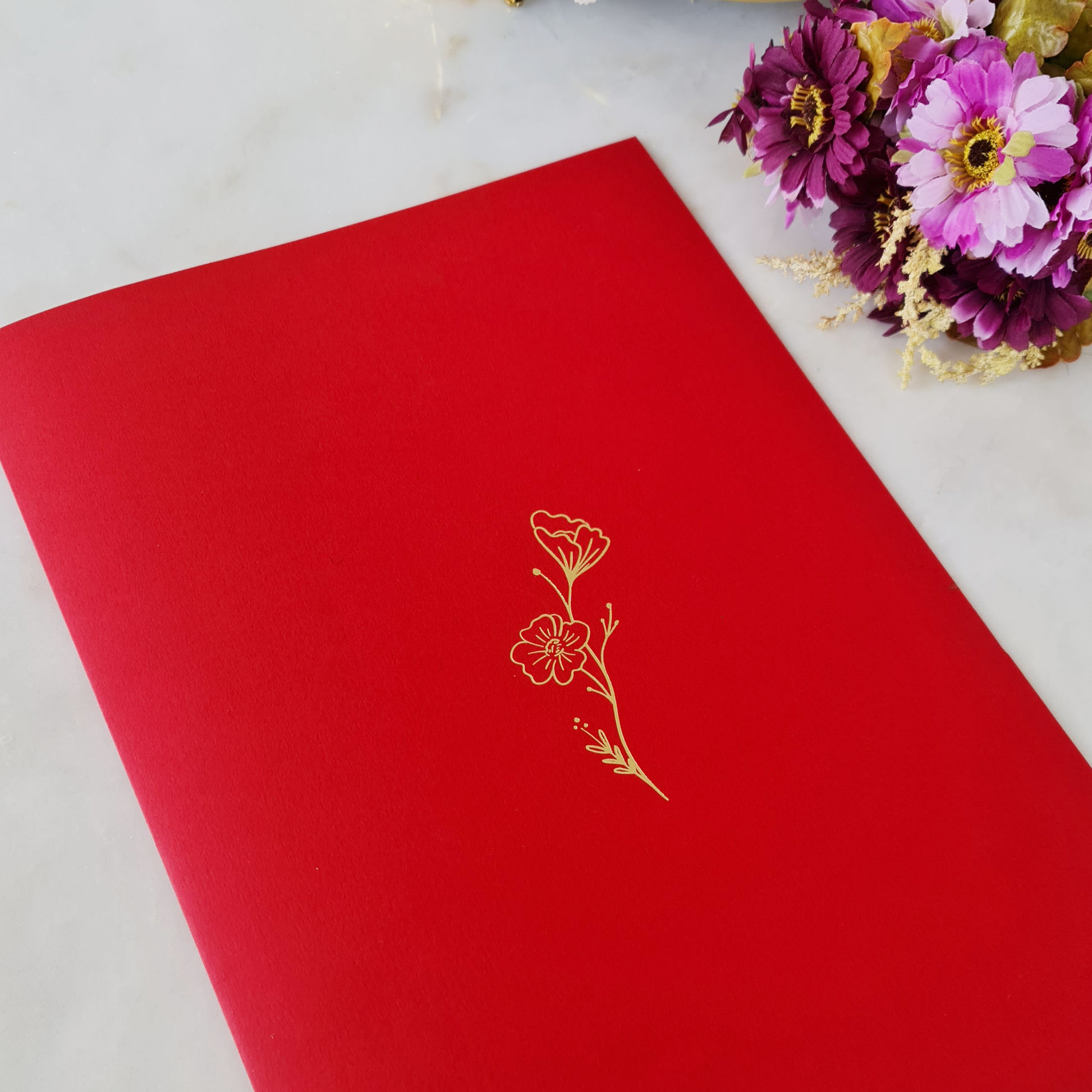 This contract is custom printed with the couple's name and wedding dates. Comes in our signature red cover with gorgeous gold-embossed flower.