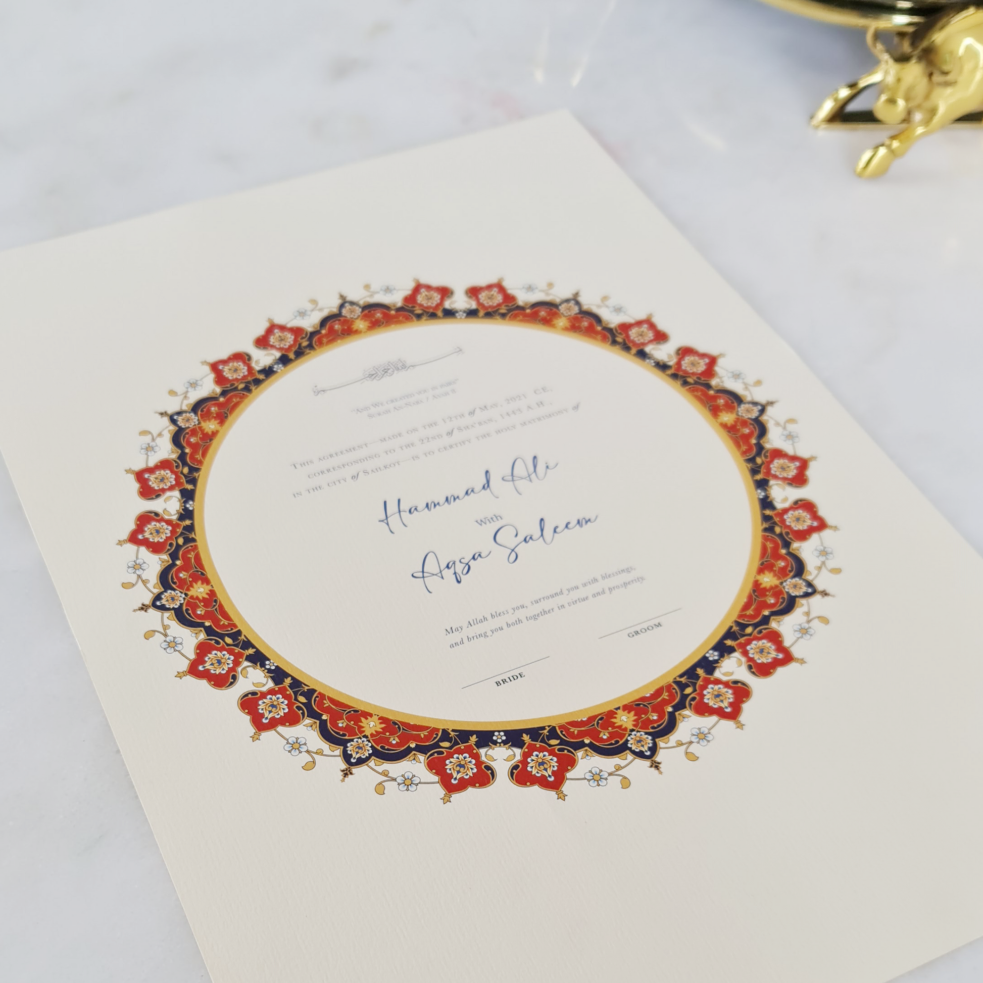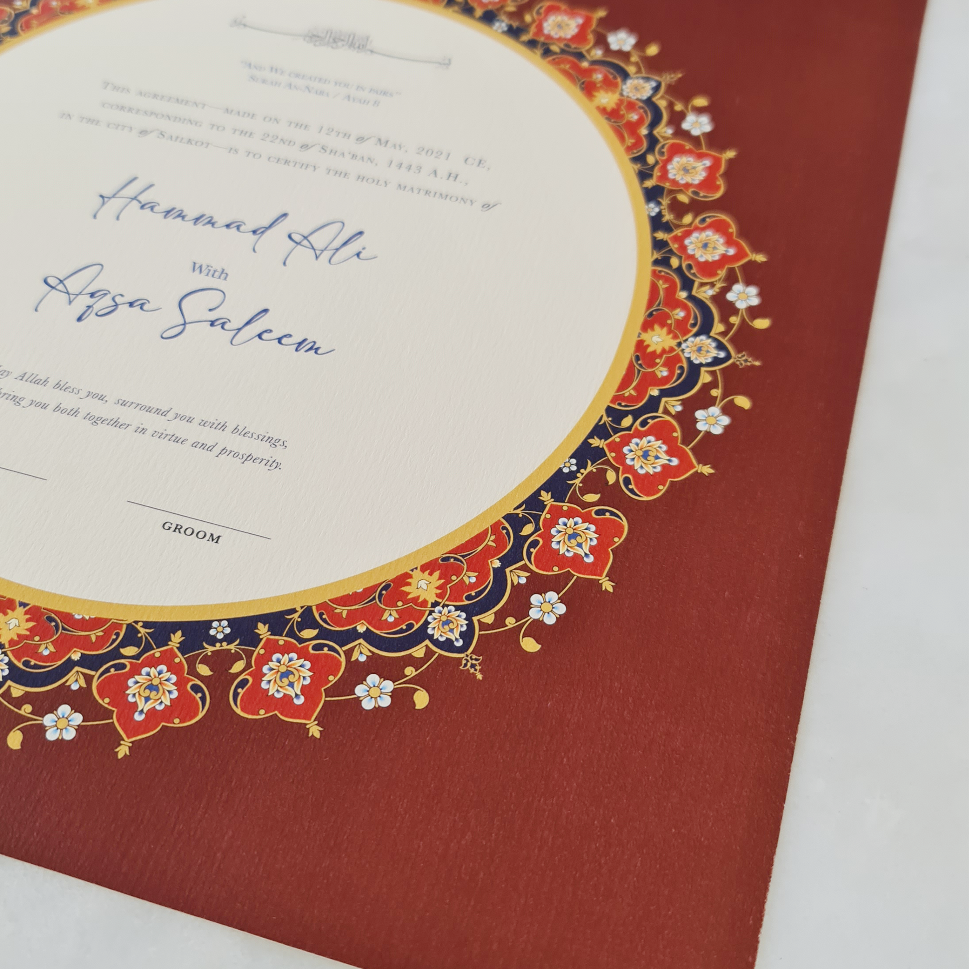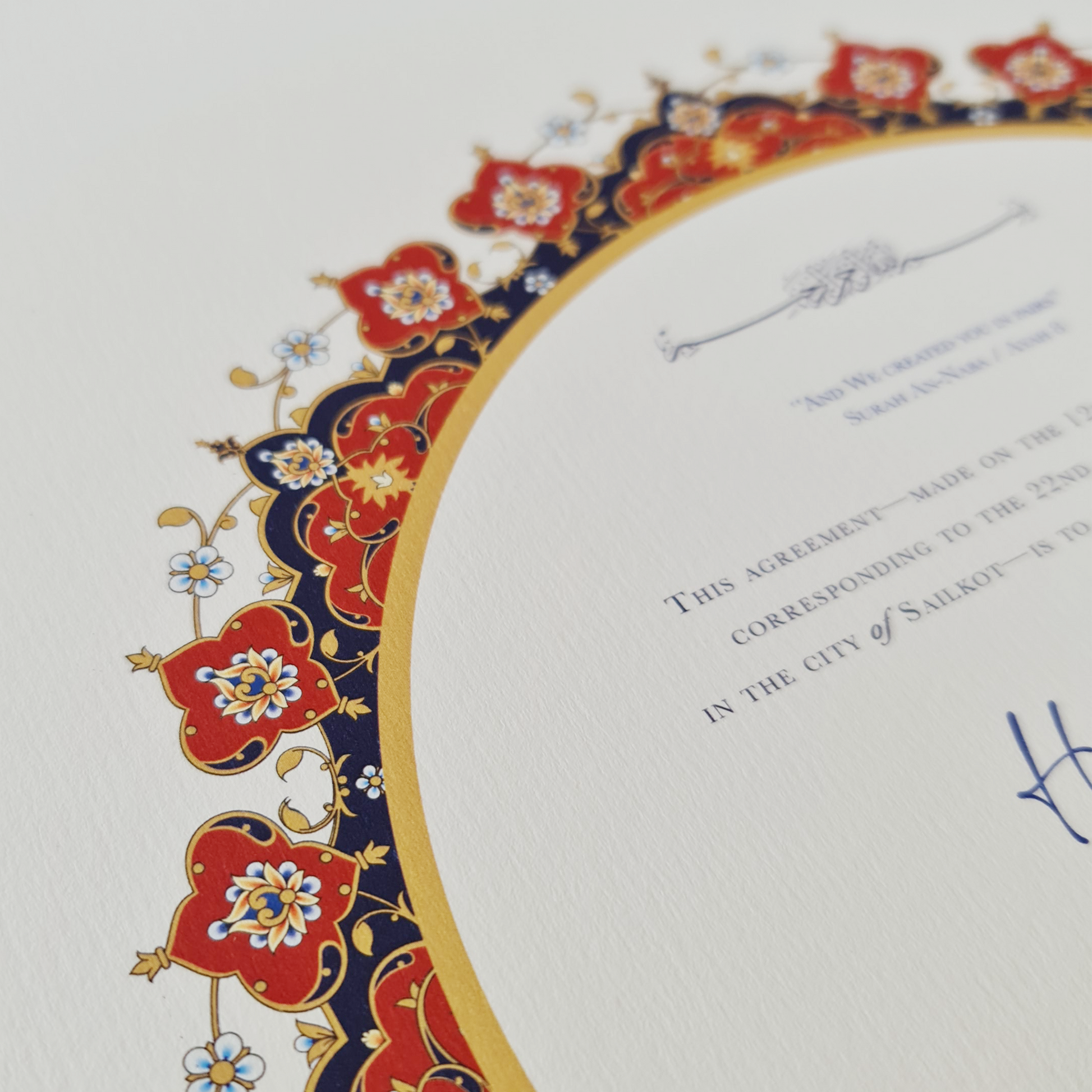 Based on a gorgeous Mughal folio, this contract is custom printed with the couple's name and wedding dates. This contract is available in maroon or gray background options.
