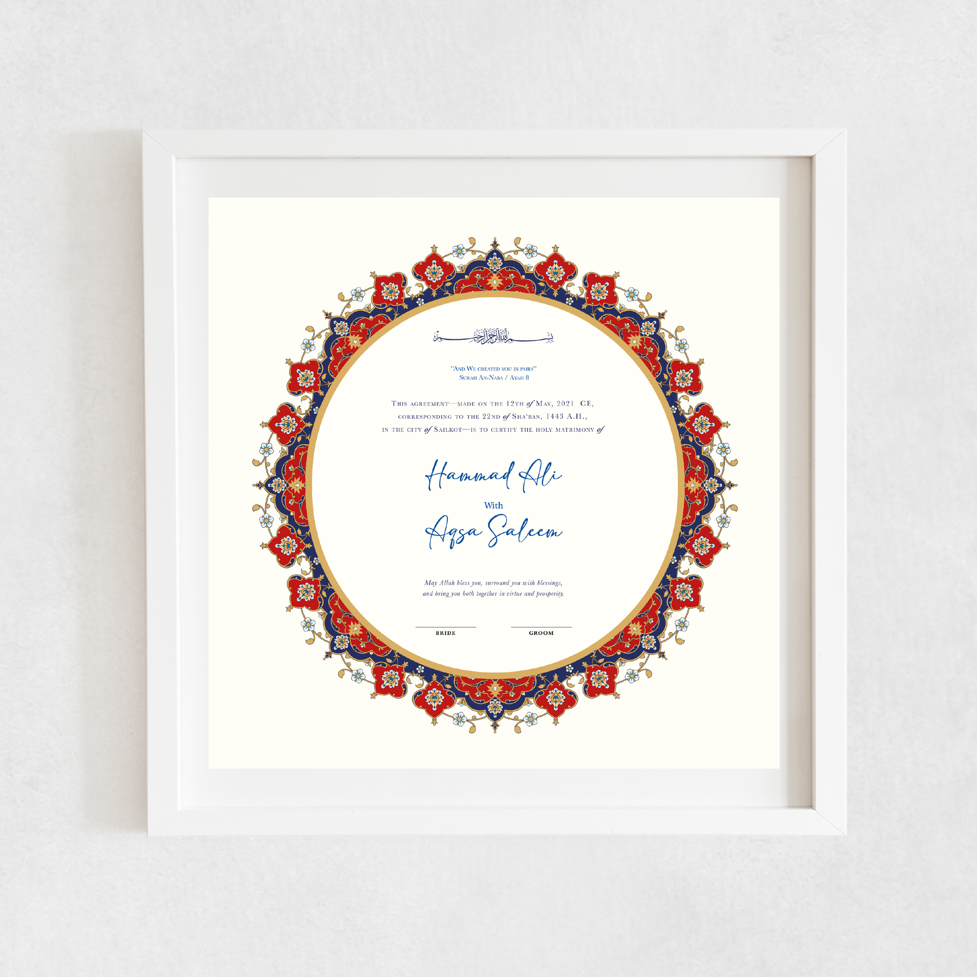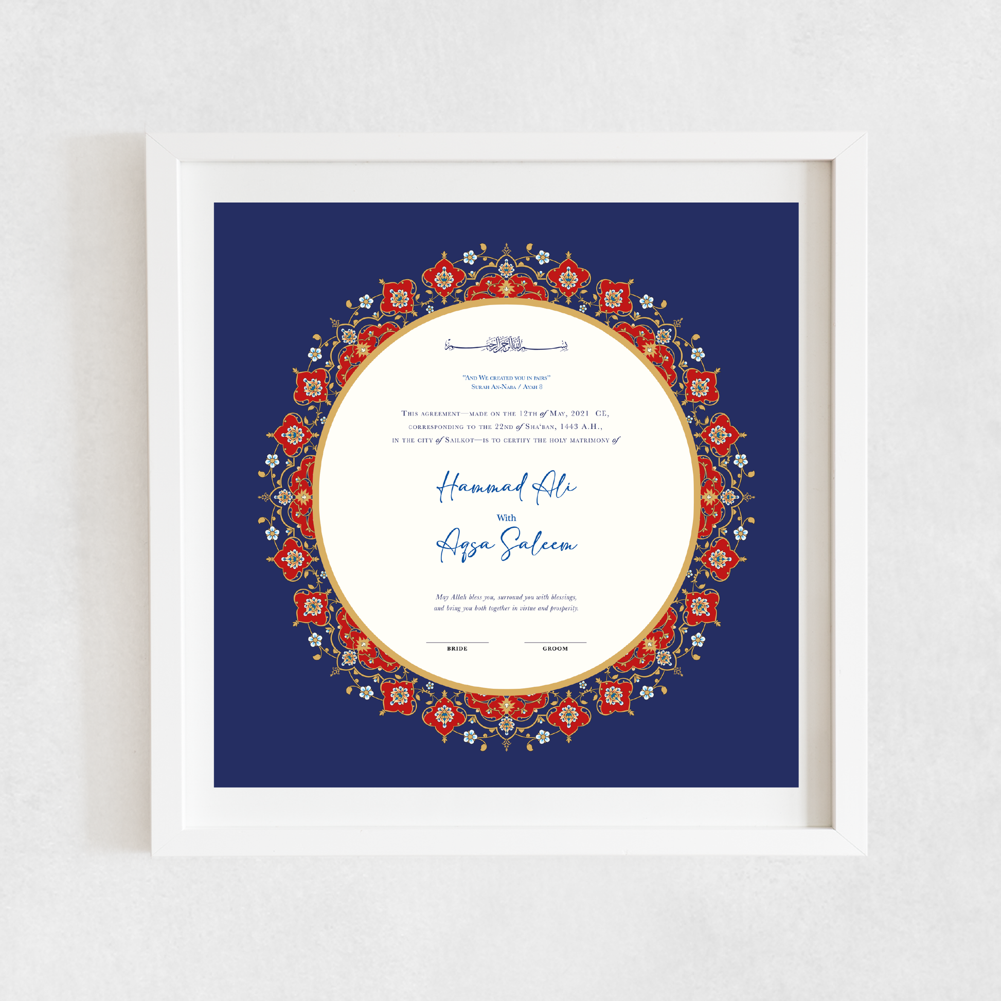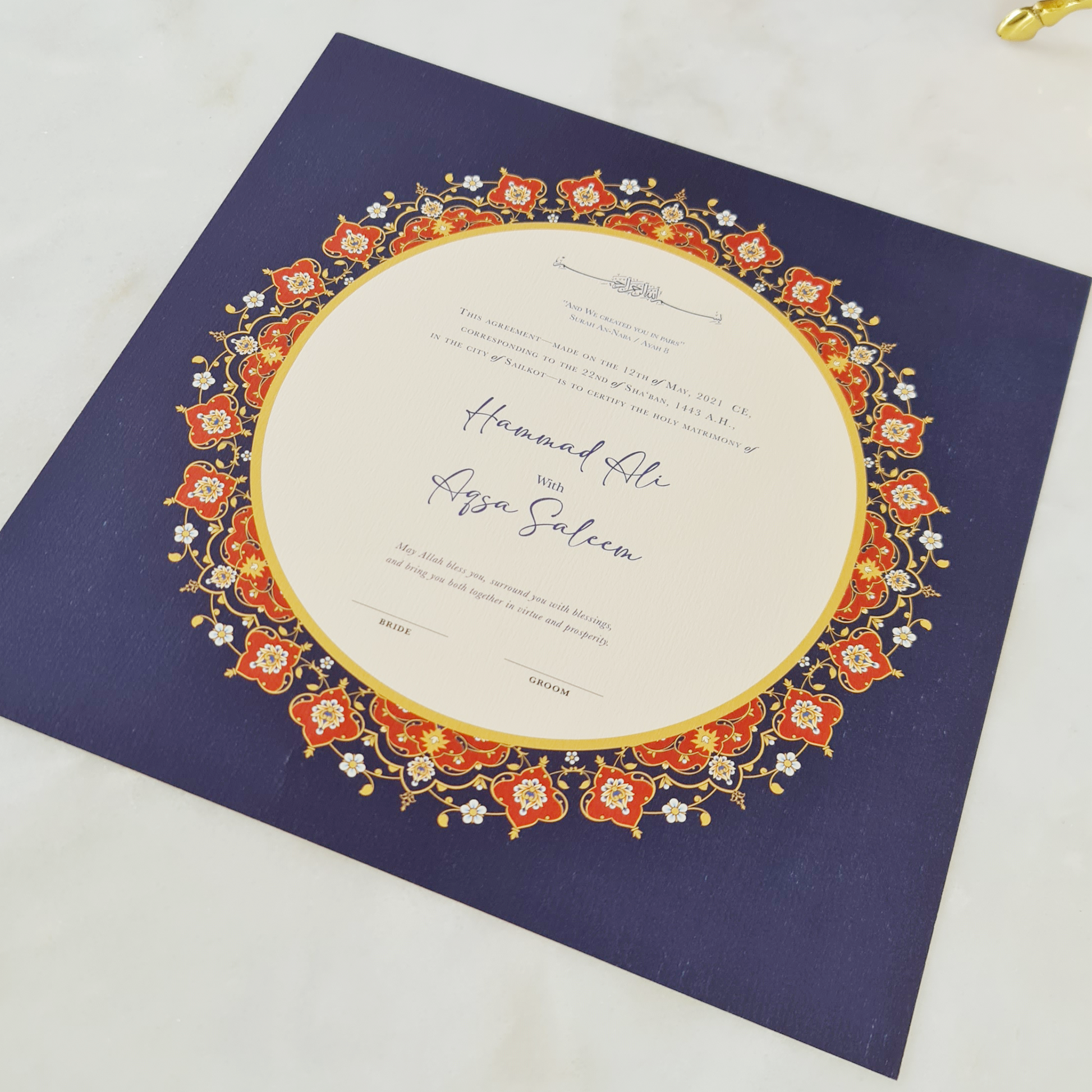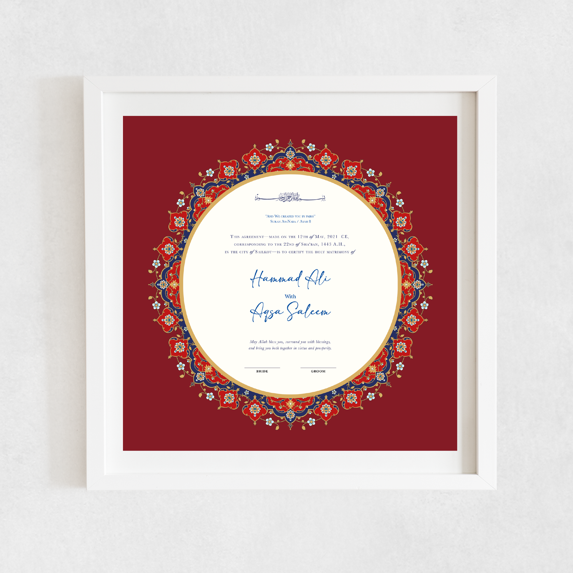 Based on a gorgeous Mughal folio, this contract is custom printed with the couple's name and wedding dates. This contract is available in maroon or gray background options.